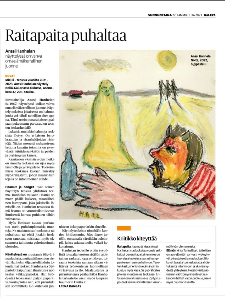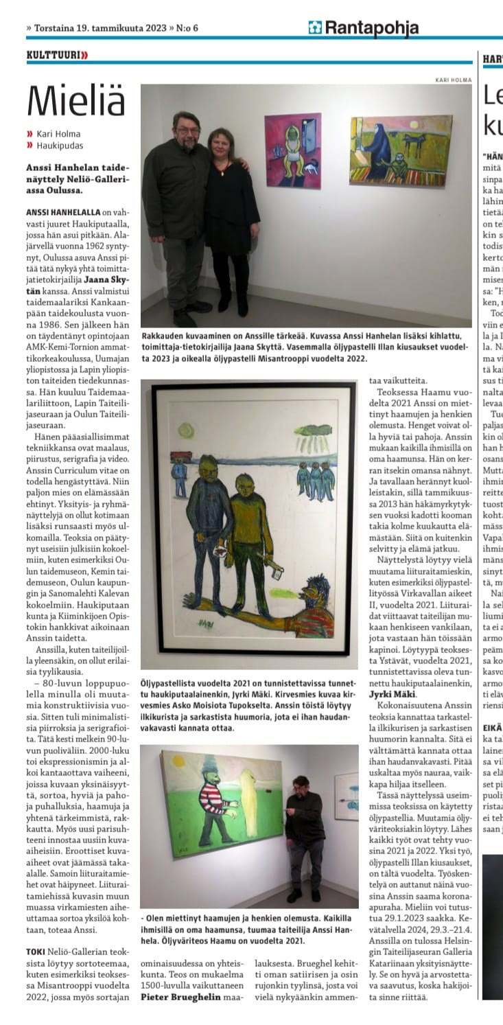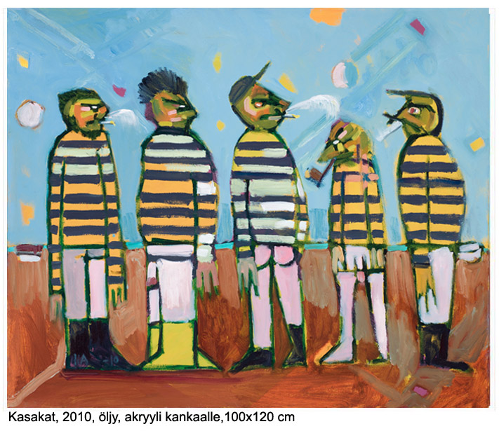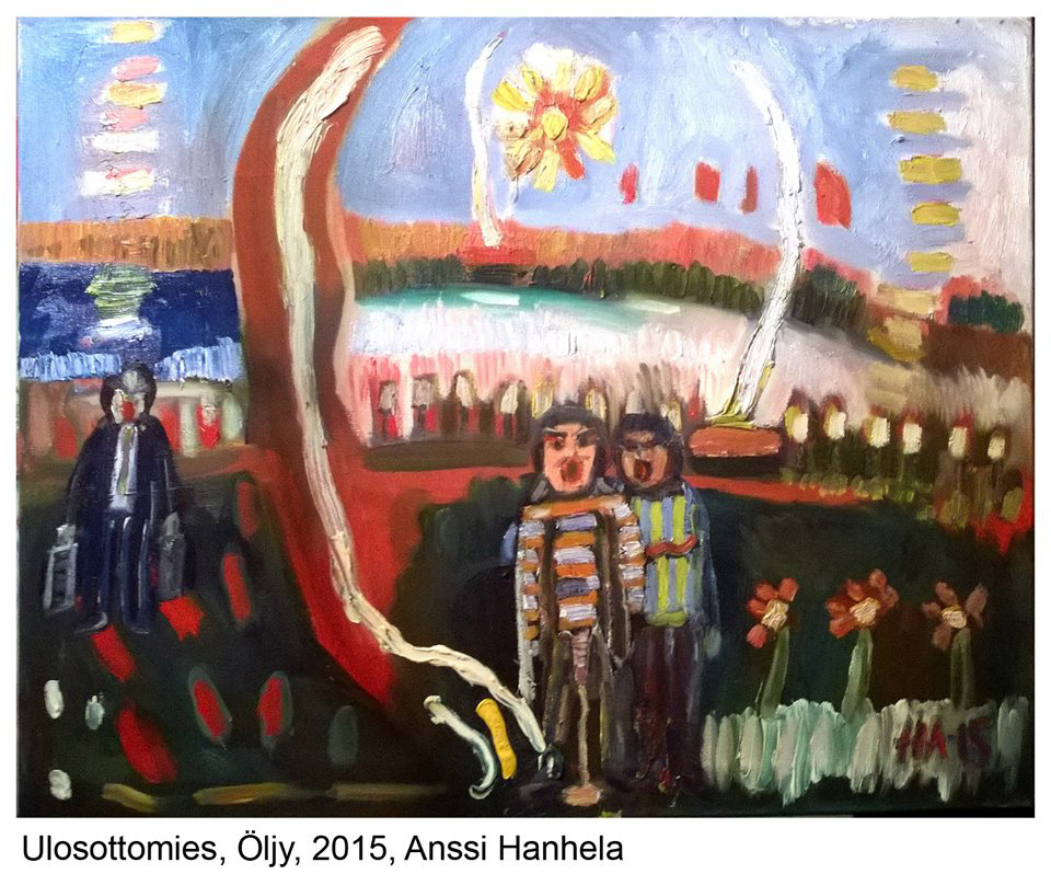 Anssi Hanhela Anssi Hanhela (b.1962) paints life. In his expressionism paintings vitality collides with existentialism. In northern mindscapes this is no wonder for one who follows his internal nature, the road leads to a place without other people. In the landscape, colors ring and ascendeth and eros is realized, glowing brightly. However, in the mystical reality of nature, man is only a voyeur and mental connection, not an organic participant. The relationship between humans is originally organic and of the body, but when another person climbs on the other´s shoulders to become a burden, it kills the possibility of organic communication. In this way, humans are only organic in relation to themselves. They are existential – beings, that feel in many ways what exists singularly and what it is to be alone. I can see this kind of perspective in Anssi Hanhela's paintings. Their narrative and painterliness express a similar content. At times freedom flows like breathing, although the soul has been captured in a zoo. At other times the internal urge flows inward with sharp consequences. The feeling of conflict is present.At the end, it is nature that calls and Hanhela's images display hope and a new kind of urge to combine inner and outer nature.